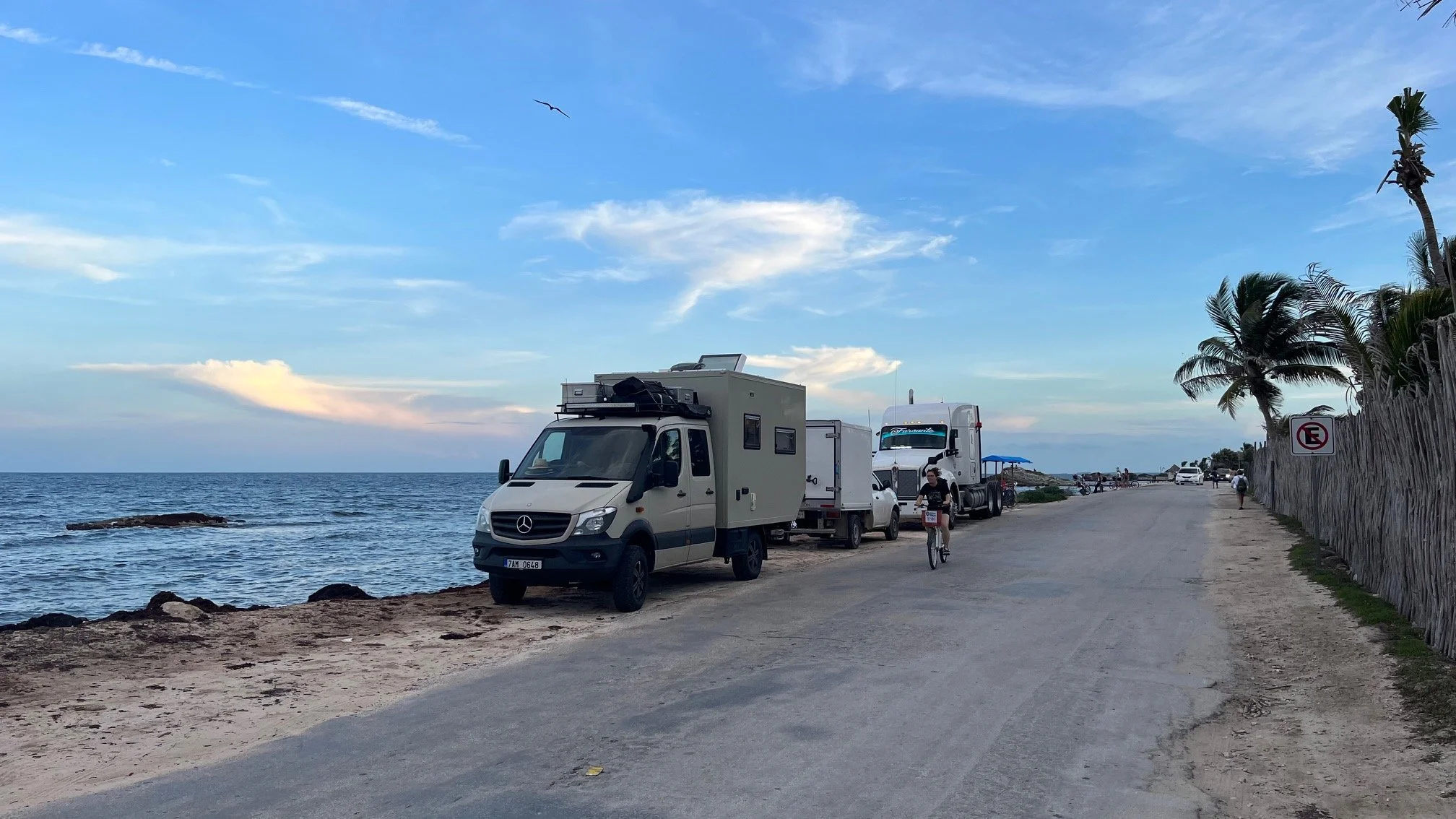 Rychle nakupuji v supermarketu – jen malé kukuřičné tortily na tacos, které potřebuji k večeři. Zažívám tam ten kulturní šok a pak už zase naskakuji do vychlazeného auta a vydávám se společně se zbytkem rodiny hledat místo k přespání. Nakonec ho najdeme hned u silničky, které vede kolem moře. Z většiny své délky je tahle silnice lemována zahradními a plážovými bary a restauracemi, jen asi 200 metrů je ponecháno volných. Mexičané ten úzký kamenitý pruh podél moře využívají k rybaření a plážování. Nám se podaří najít jedno místečko k zaparkování na krátkém úseku, kde je možné podél silnice parkovat. Moře máme asi 5 metrů od auta, jeho hučení přehluší rachot projíždějících aut i hlasy procházejících lidí.
