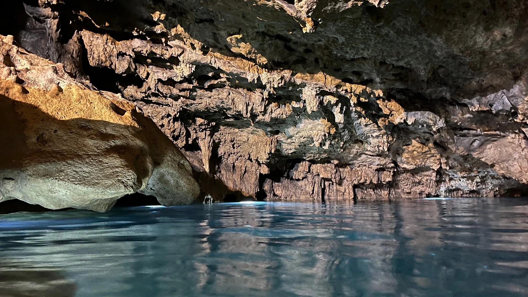 Vůbec netuší, jak teplá nebo studená voda je, jak je hluboká, ale jsou rozhodnuty skočit šipku rovnou a hned. To jim pochopitelně nedovolím. Voda je příjemně chladivá (tipuji tak 27°C, ale fakt tipuji). Není nad to se do ní ponořit a hloubkově vychladit celý organismus. Týna v jeskyni plave kolem dokola, Joli s Kubou dovádějí vybarveni potápěčskými brýlemi. Janek přijde teprve po čtvrt hodině.