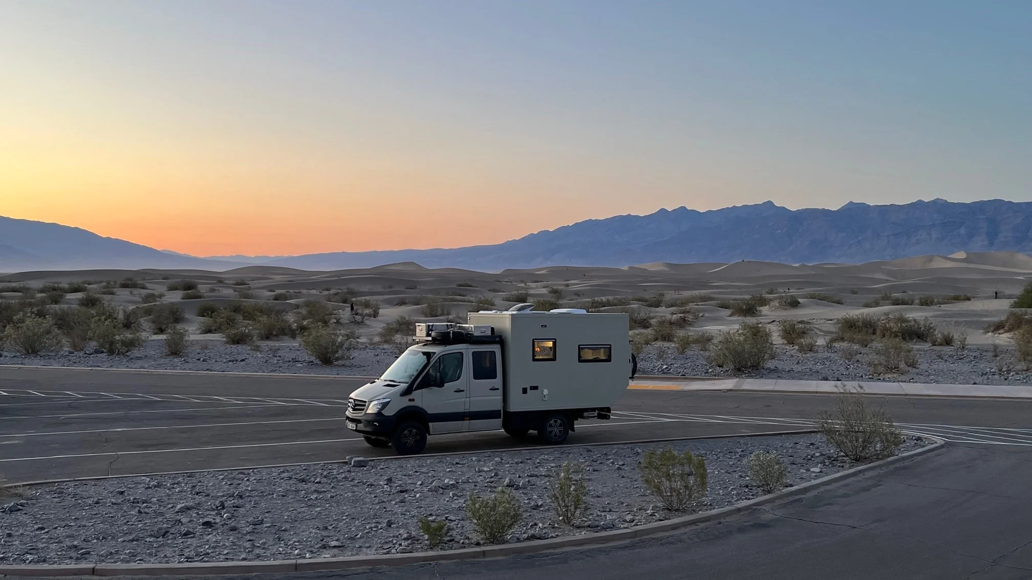 Vracíme se zpět k dětem, přejíždíme k písečným dunám, kam ale dorazíme už po západu slunce. Sníme večeři a míříme ven z parku. Nejdřív vystoupáme hrozně vysoko (asi 1500 m) a pak to skoro celé zase sklesáme. Cestou nabereme trochu nafty. Táboříme kousek za hranicí parku za skalou kousek od hlavní cesty.
