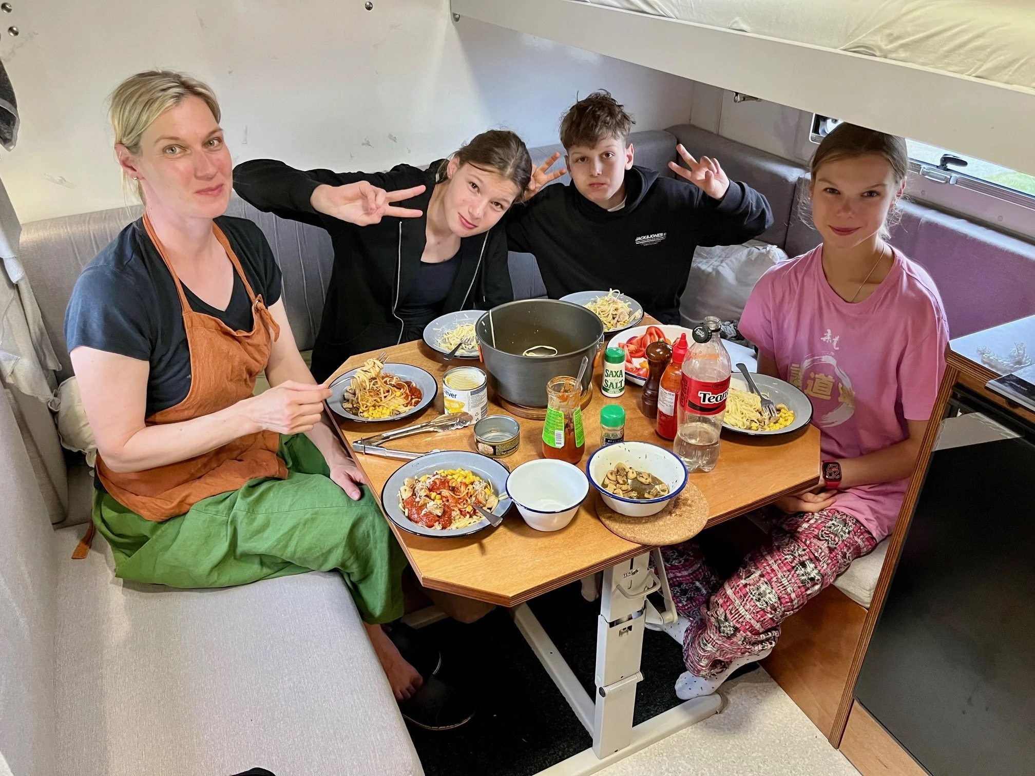 Je moc fajn mít takhle velké a samostatné děti. Kuba, který dorazí jako první, odemkne auta a Joli, které cesta zabrala jen o 5 minut déle, dá vařit vodu na těstoviny. Když se z výletu vrátíme my ostatní, voda skoro vře. K večeři máme těstoviny se skleněnou omáčkou, tuňákem z plechovky a dušenými žampiony. Kuba si vyžádá plechovku kukuřice, protože ta přece dává těstovinám „ten správnej zeleninovej fíl“.