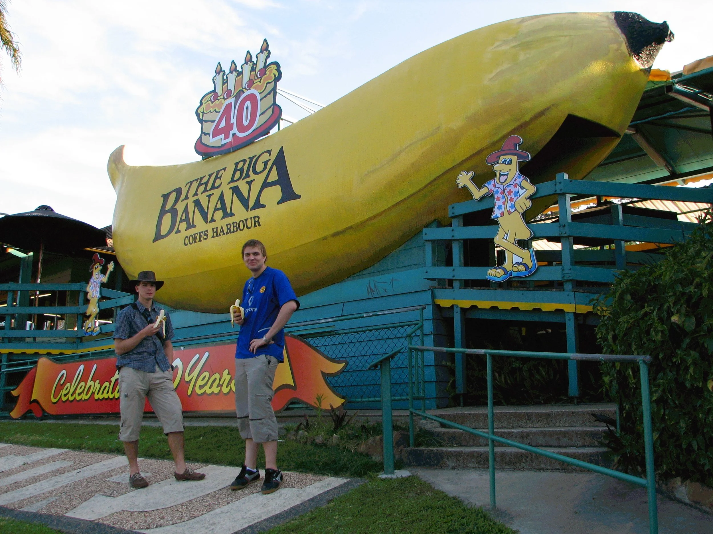 Těsně před setměním zastavíme u Big Banana (Velkého banánu) první velké věci, kterou kdy kdo postavil v Austrálii. Celá atrakce je už zavřená. My se jen vyfotíme a pak si na parkovišti rozložíme stůl a židličky a dáme si večeři. Od Jenny jsme jako výslužku dostali chléb a tortilly (fakt jako od babičky), přidáme k nim nějakou bílkovinu a zeleninu a máme plnohodnotnou večeři.