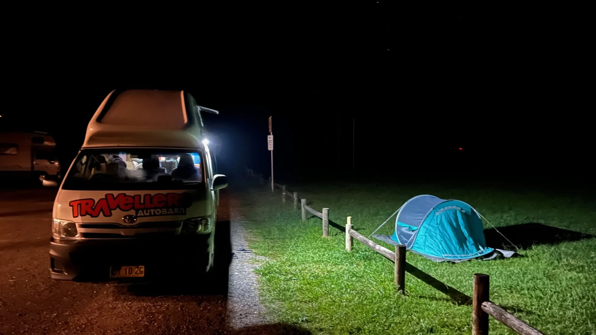 Když zaparkujeme, je už tma a nad travnatou plochou je zvláštní mlha. Vlhkost je 100 %. Postupně se ochladí, takže se dobře spí. Vytáhneme si židličky a stolek a sedíme venku, protože tu nejsou komáři. Je to naše první opravdová noc v tomto autě. Zasedací pořádek si teprve hledáme. Holky spí dole, já s Kubou nahoře a Janek v plážovém stanu, který jsme dostali od Kena.