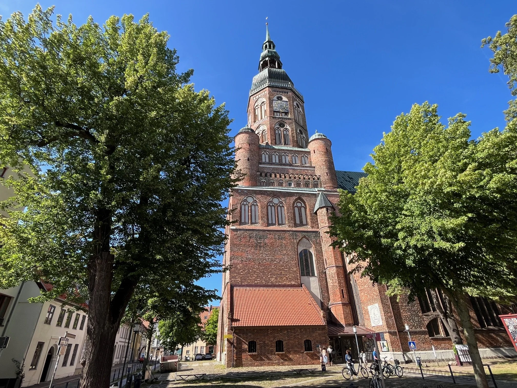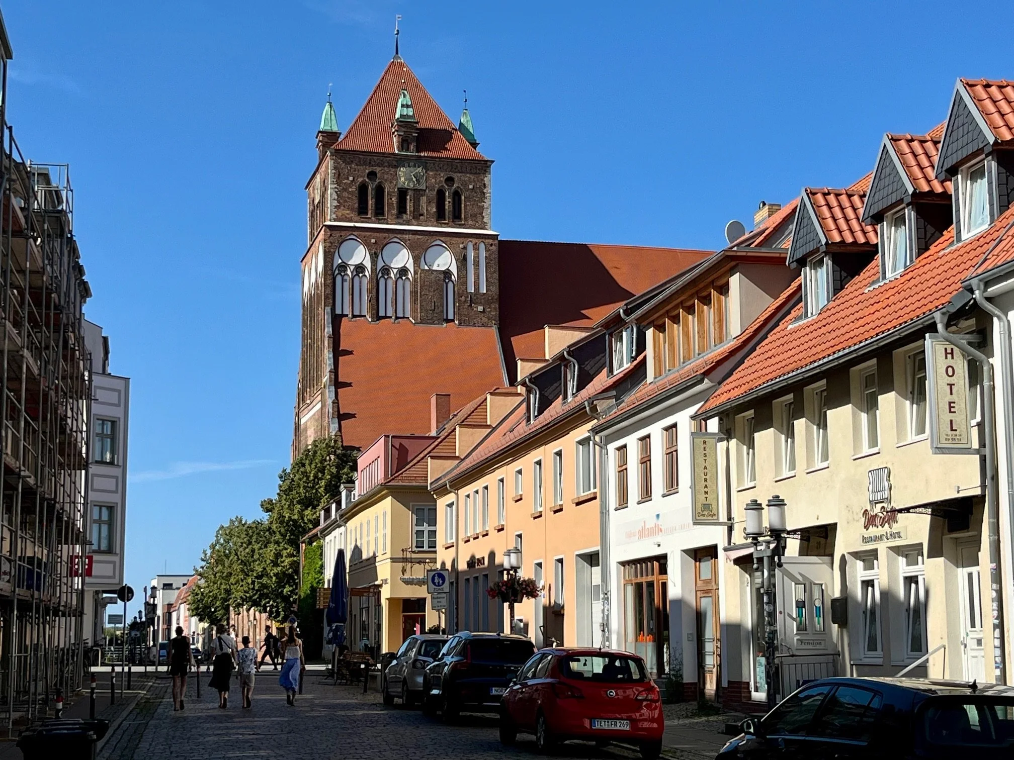 Po hodinovém přejezdu a čtvrthodinovém hledání místa k zaparkování ve městečku Greifswald vyrazíme na prohlídku města, které se pyšní třemi kostely viditelnými už z dálky. Podle jejich proporcí se jim přezdívá Tlustá Marie, Dlouhý Mikuláš a Malý Jakub. Děti se shodnou na tom, že už do žádného kostela nechtějí. K jejich štěstí je v neděli odpoledne přístupný jen Dlouhý Michal – gotický cihlový kostel s vysokou štíhlou věží. Kostel zdobí moderní vitráže. jednou z nich dopadá na podlahu barevná mozaika světel. Je to taková krása, že donutím děti stojící doposud venku, aby se šly taky podívat. Pak jim ještě ukážu, že původně interiér kostela celý cihlový, ale později byl celý omítnut a vymalován čistě bíle.
