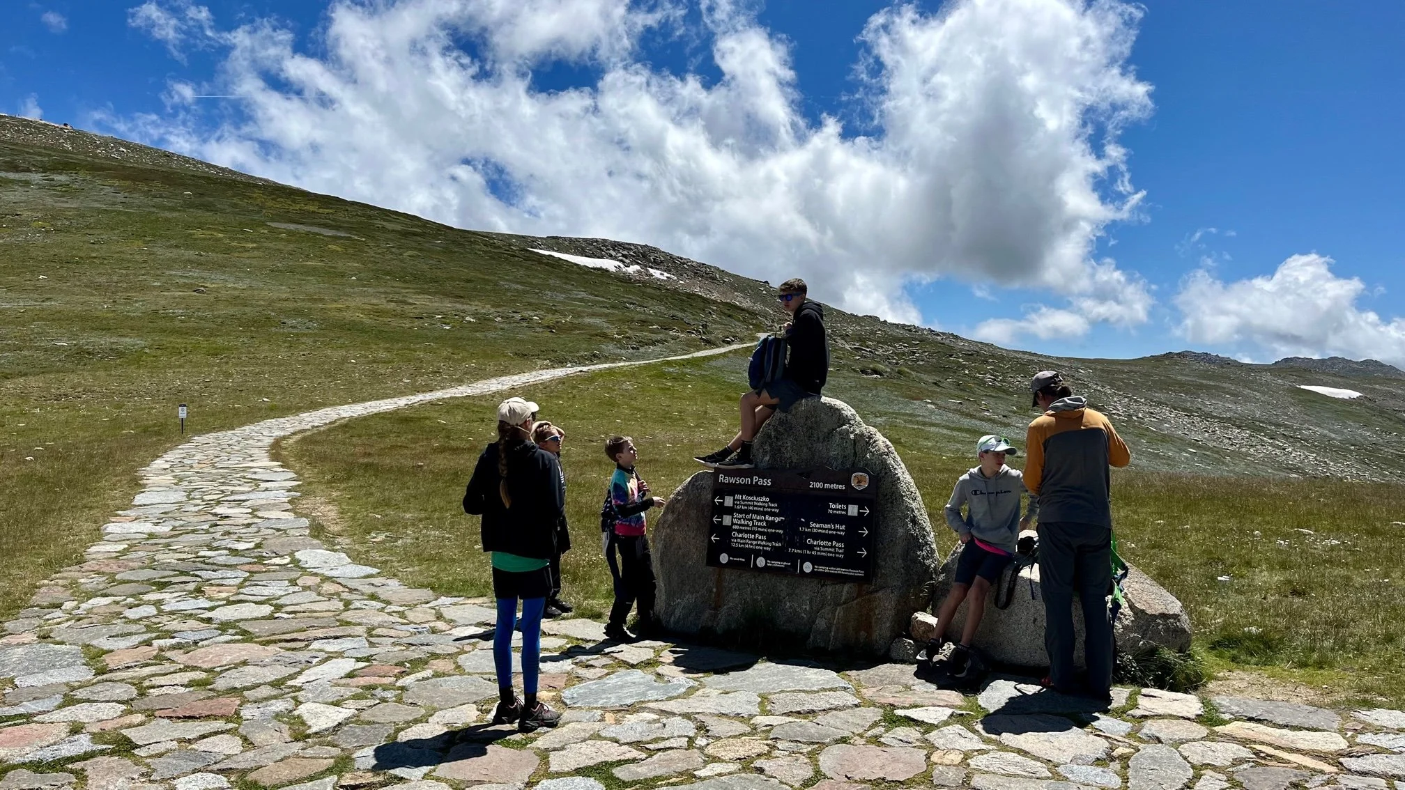 Zaplatíme tedy v Thredbu, zároveň se vyptáme na cestu na Mt. Kosciuszko, nejvyšší vrchol Asutrálie. Je to snadné, stačí nastoupit na lanovku a pak ujít 6,5 km mírně do kopce. Koupíme se tedy lístky, zkušeně nasedneme na čtyrsedačku a necháme se vyvést z nadmořské výšky 1380 m o 540 m výš. Terén se zvolna vlní a pomalu stoupá. Většina trasy vede po železném roštu, po kterém by se dalo jet i s kočárkem. Oběd si dáme na vyhlídce na Mt. Kosciuszko a pak pokračujeme dál na horu. Děti statečnou šlapou. Počasí nám přeje – po studené noci, je krásný jasný den, teplo tak akorát na mikinu.