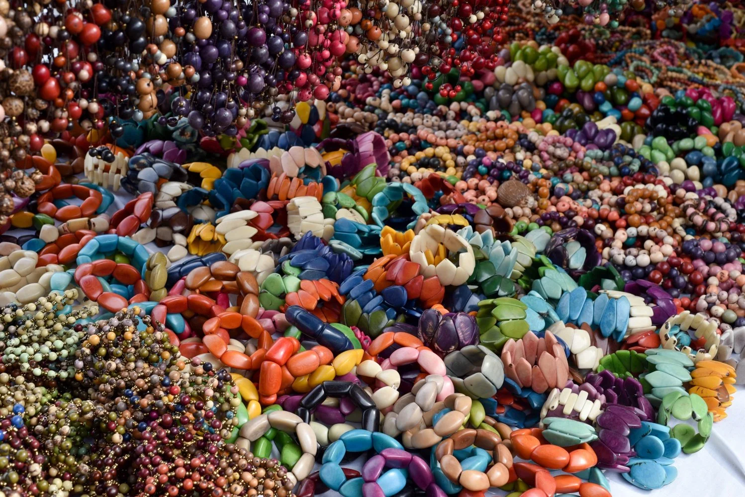 Já neodolám zajímavému náramku z barevných korálů ve tvaru plochých deltoidů. Výběr náramků je veliký – mohu se vybrat tvar korálů a jejich barvu. Jednobarevných náramků je nejvíc, ale já si vybírám ten nejbarevnější – každý korálek má jinou barvu. Prodejkyně tvrdí, že materiál korálů je „natural, nou plastik“ a ukazuje mi jakýsi hnědý ořech či co. Moc se mi tomu nechce věřit. Prodejci totiž často říkají to, co chce turista slyšet tj. že je to lokální, tradiční, ručně vyrobené, přírodní, bio, eko. Takže všechna ponča na trhu jsou podle nich z alpaky, z vlny nebo jejich směsi padesát na padesát. Přitom na omak i podle ceny je jasné, že ponča alpaku neviděla ani náhodou. Takže informaci ohledně přírodního materiálu korálů ignoruji, protože mi připadá jako prodejní trik na turistu z Evropy.