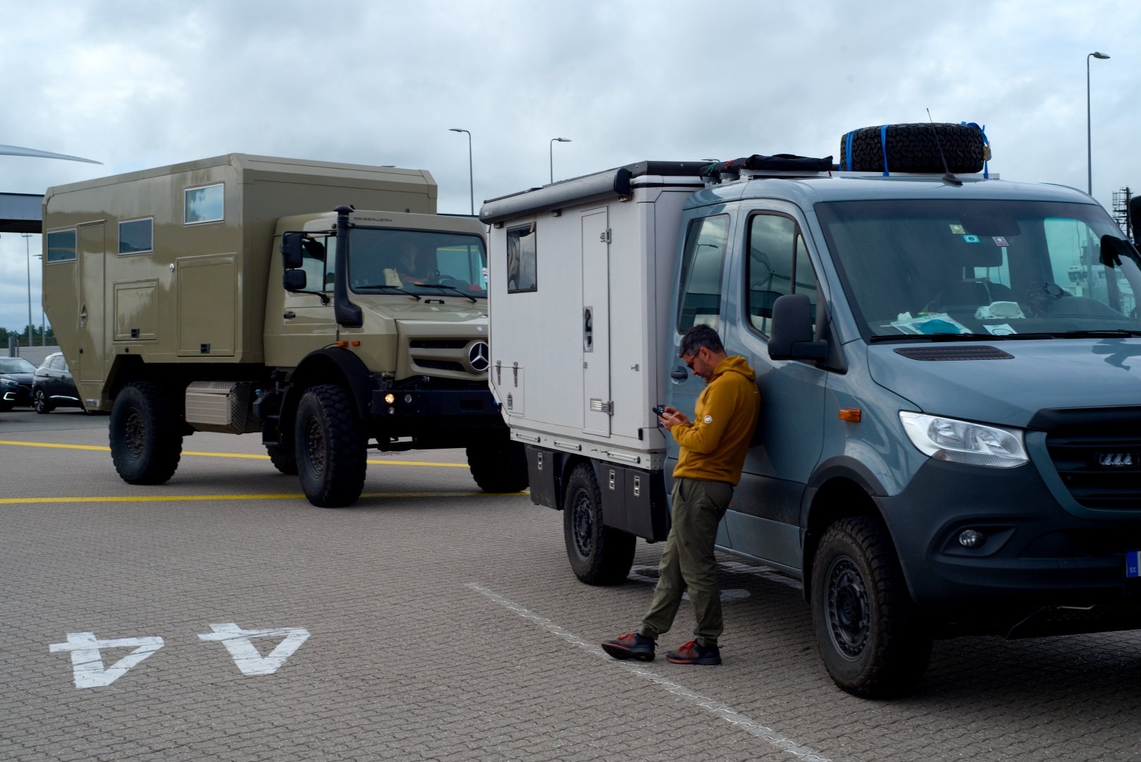 Čekáme poměrně dlouho. Loď přistála s hodinovým zpožděním, a tak je vše stejně opožděné. Najíždění na trajekt také zabere spoustu času, auta uvnitř trajektu musí stát s minimálními rozestupy, aby se využil každý centimetr nákladního prostoru. Nás zřízenec posílá úplně dozadu, kde pozorujeme, jak jiný zaměstnanec naviguje obytná auta, aby zaparkovala přesně tak, jak je potřeba. Divoce přitom gestikuluje. Když parkuje Janek, vyskočím z kabiny a celý proces natočím na video.