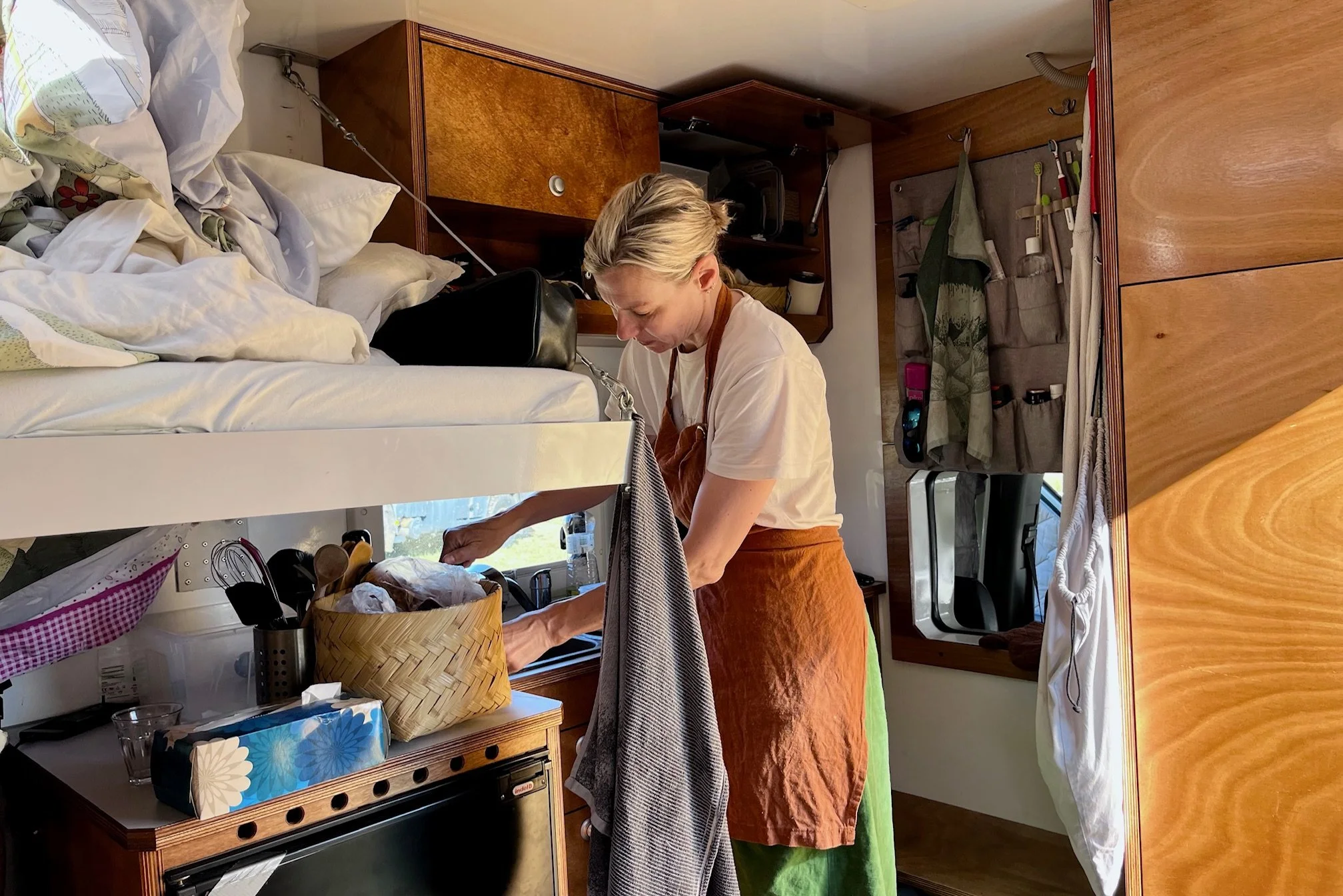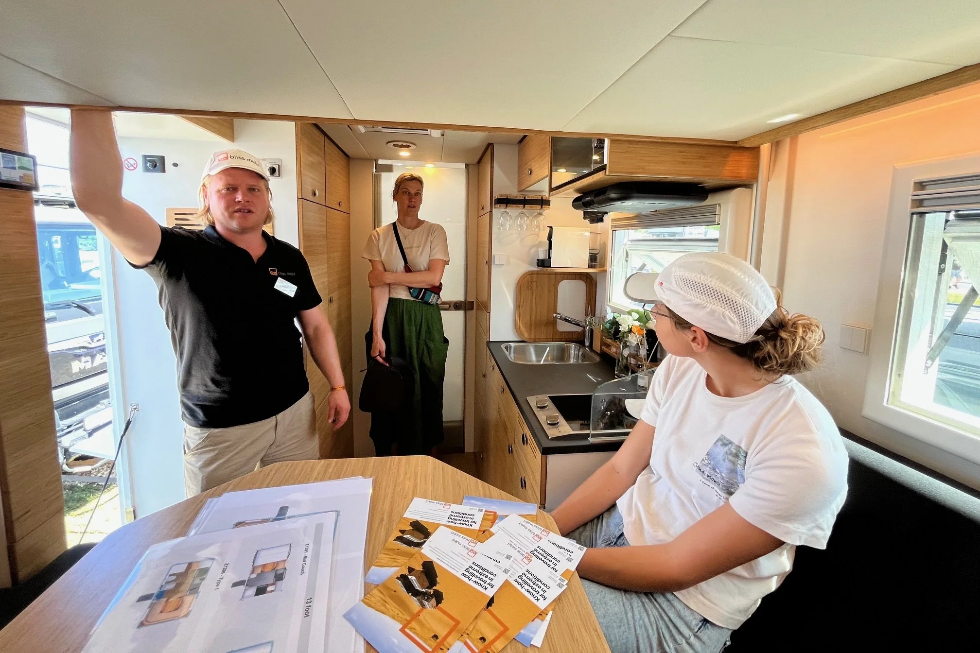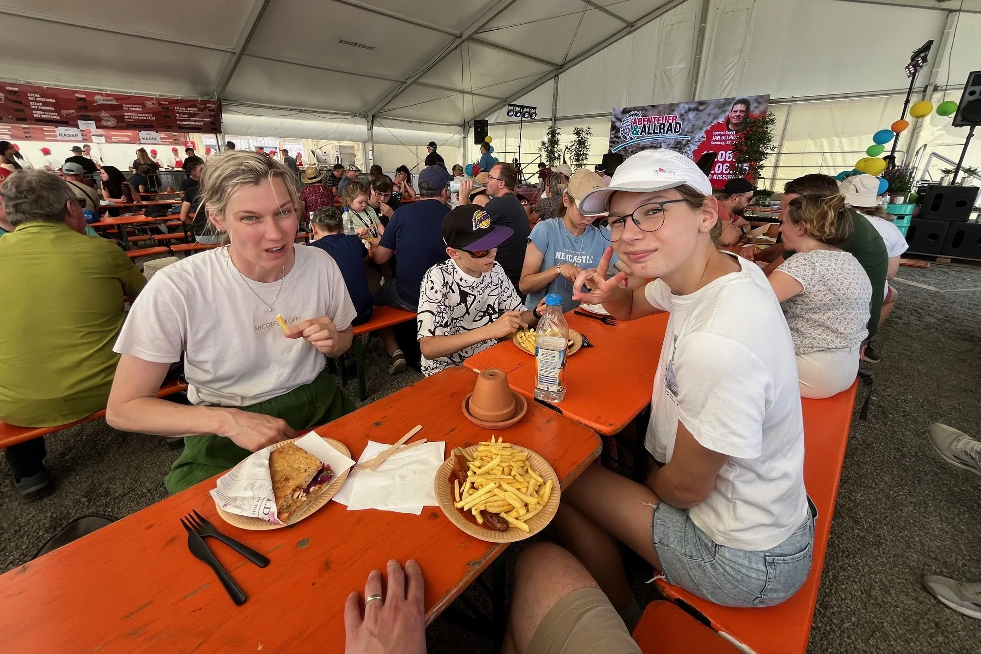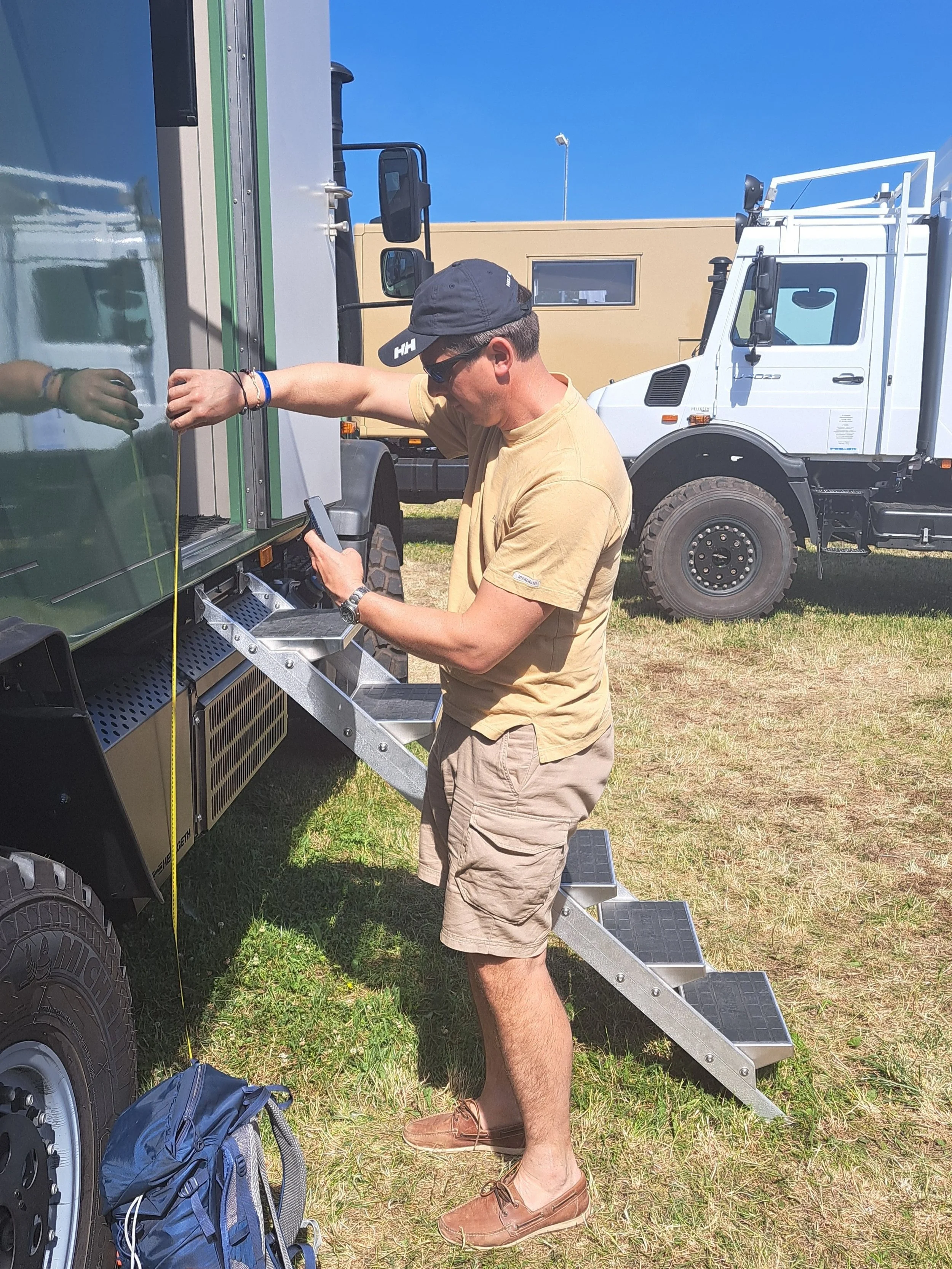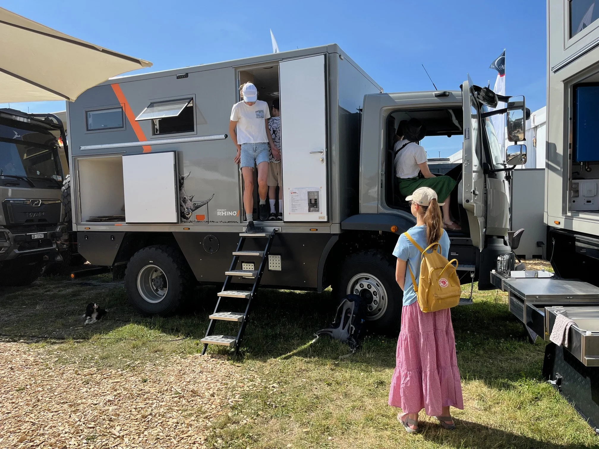 Při ranním smažení lívanečků je ještě příjemně. Později teplota začne narůstat a odpoledne se udělá nesnesitelné horko. Po zkušenosti ze včerejška sbalíme do jednoho batohu plavky a ručníky a děti vyhledají ve městě koupaliště. Do druhého batohu dáme lahve s vodou a müsli tyčinky na svačinu. Lehce oblečeni vyrazíme na autobusovou zastávku kousek od místa, kde kempujeme. Výstavní areál se nachází mimo město, od kempovací oblasti je vzdálený 5 km a tak organizátoři připravili kyvadlové autobusy, které vozí návštěvníky mezi kempem a výstavištěm. Do jednoho takového nasedneme a necháme se dovést na veletrh.