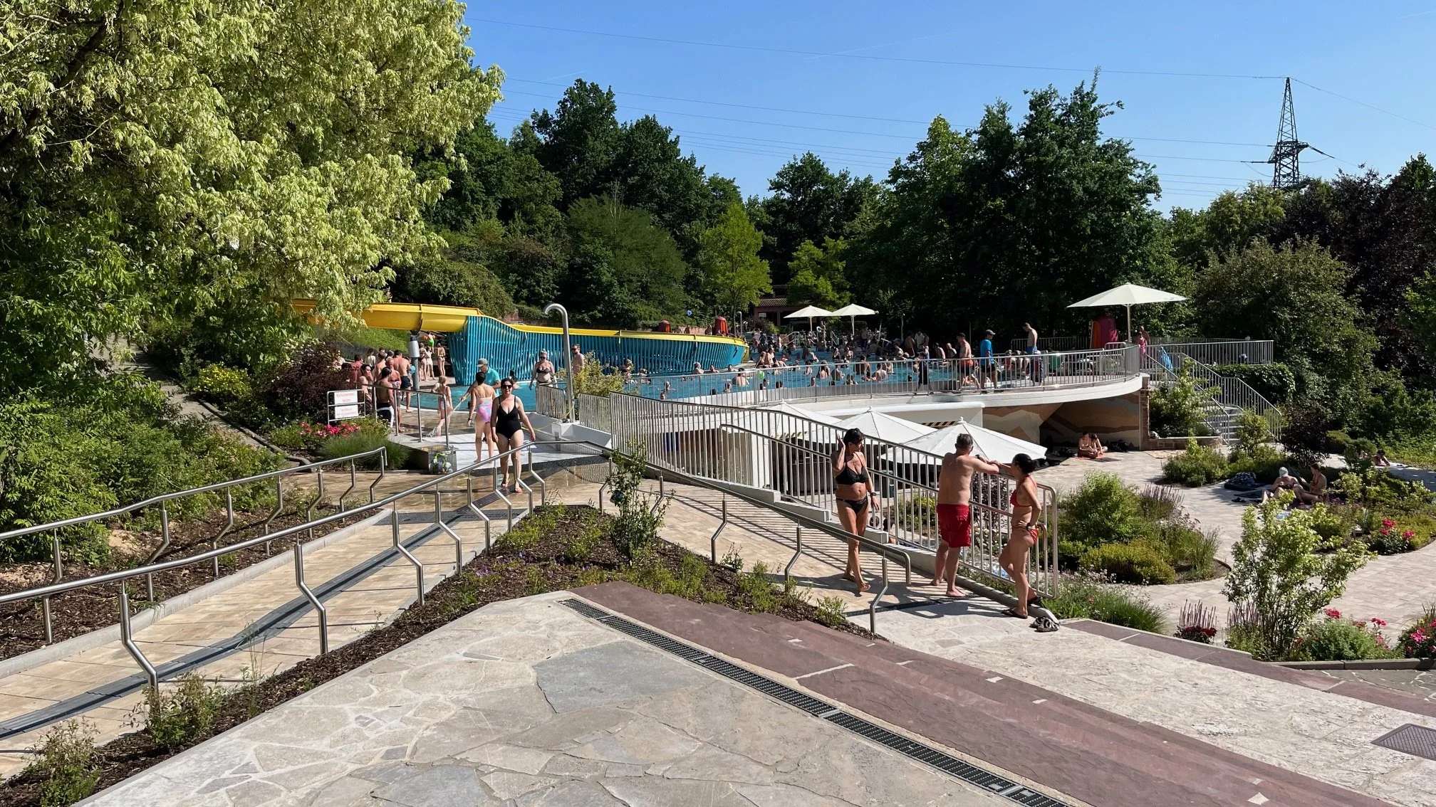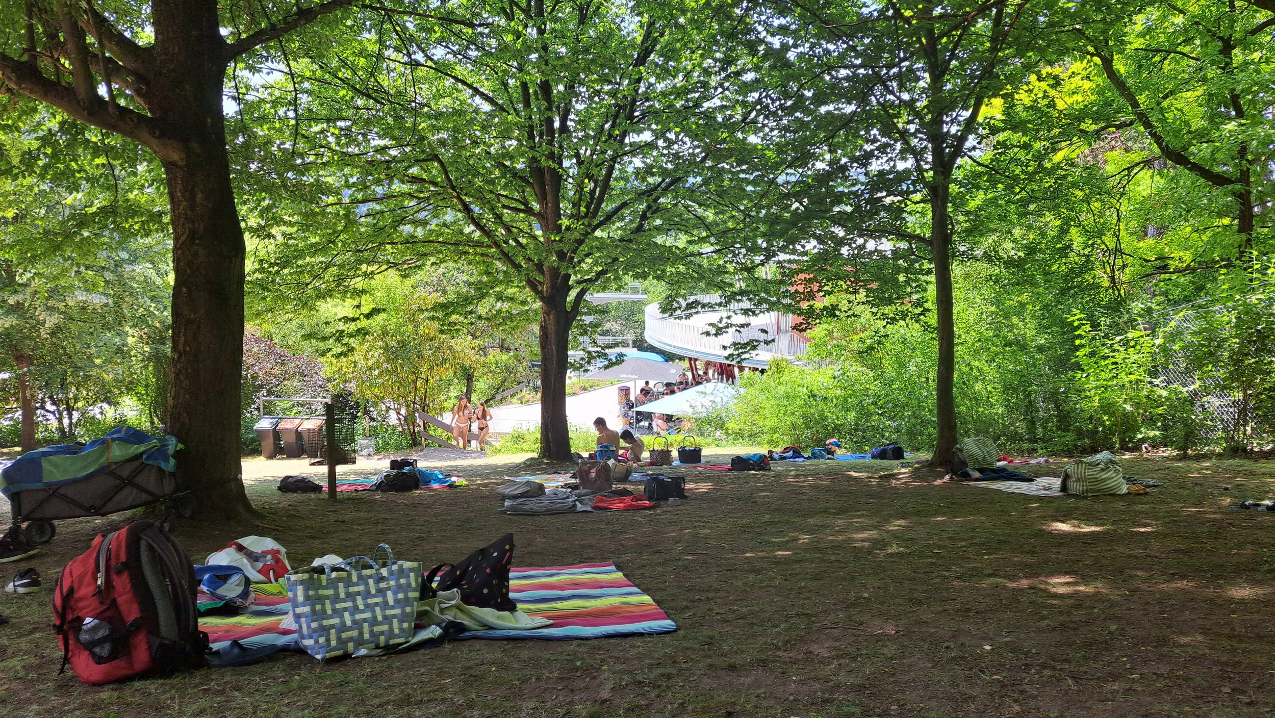 Je to sice jen kilometr, ale posledních 400 metrů do kopce. Na koupaliště dorazíme uřícení. Žena na pokladně mi něco vysvětluje, ale já neumím německy a tak jí vůbec nerozumím. Vyjde tedy ven z pokladny, zavede nás do areálu a ukáže nám, že část koupaliště se zrovna opravuje. Je to zrovna ta část, kterou bychom si užili nejvíc – velký bazén, ale co naděláme. Lepší mělčí bazén a tobogán než nic. Kupuju lístky. Už jsem z toho vedra celá vzteklá. Převlečeme se, najdeme místo ve stínu stromů a děti jsou do vody. Já si jdu koupit kafe a něco studeného k pití, abych se uklidnila.