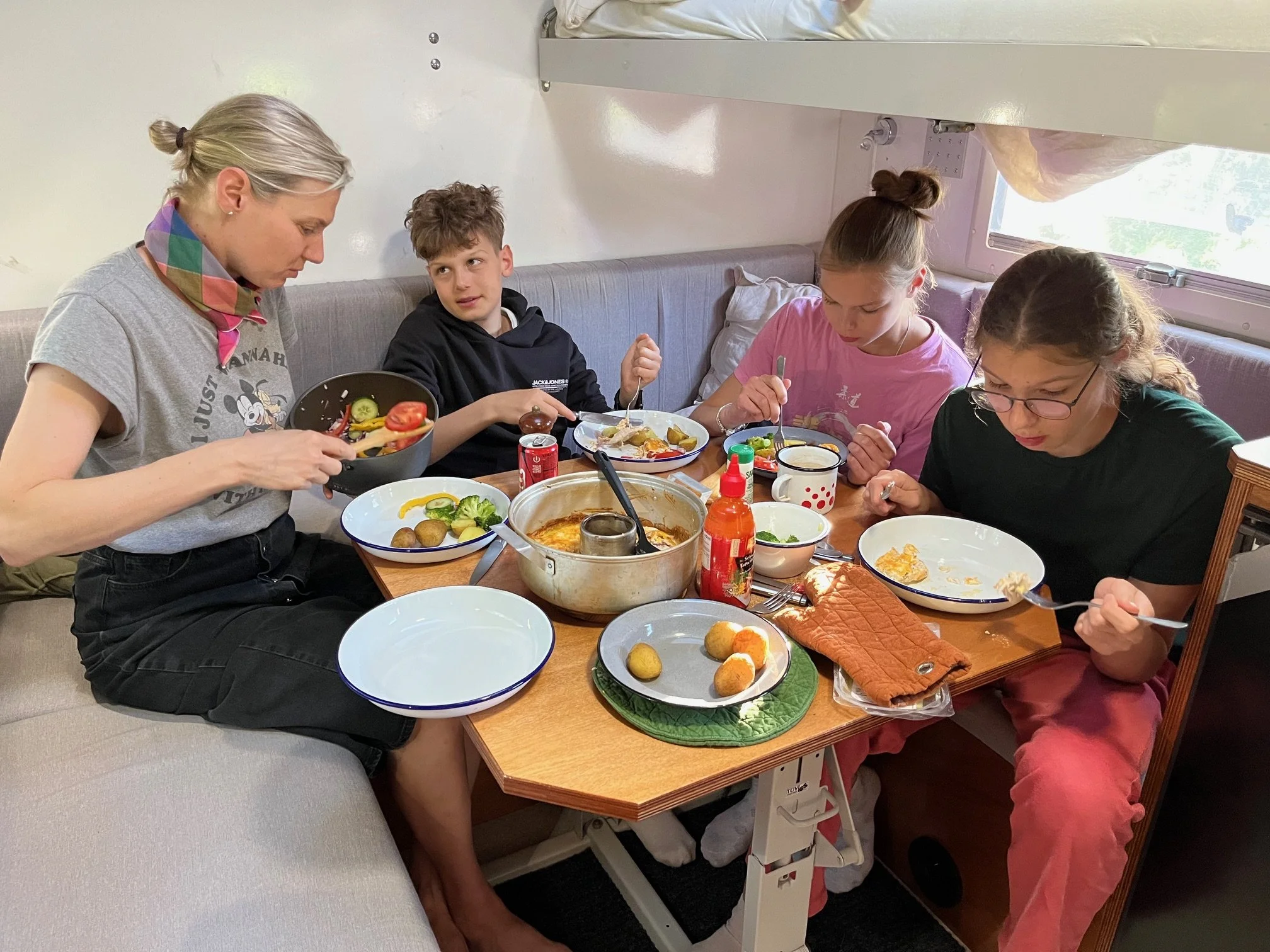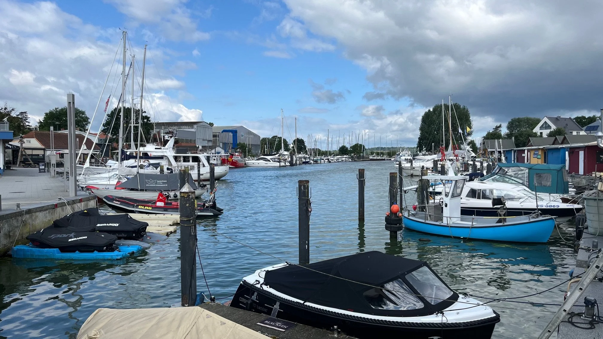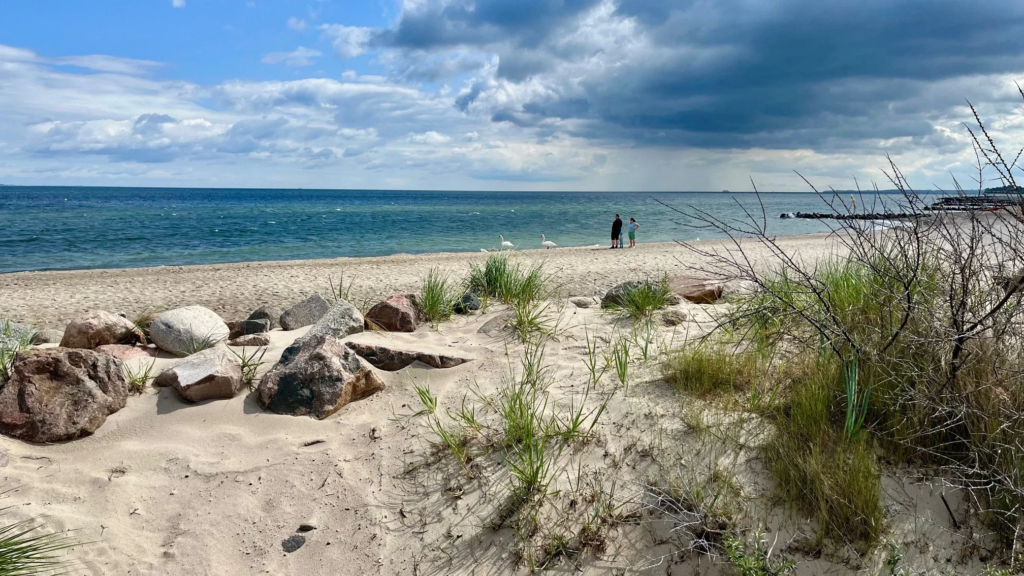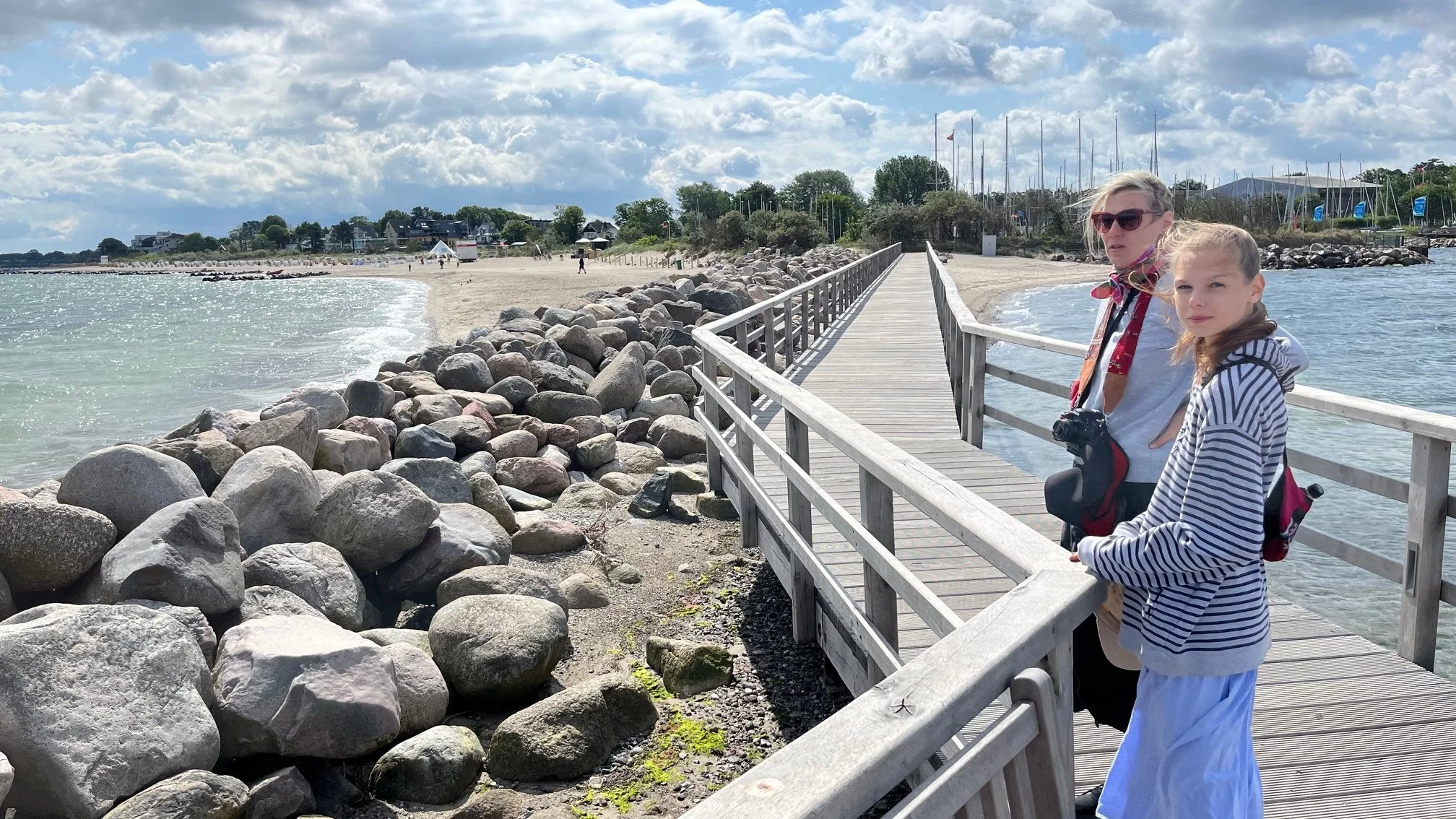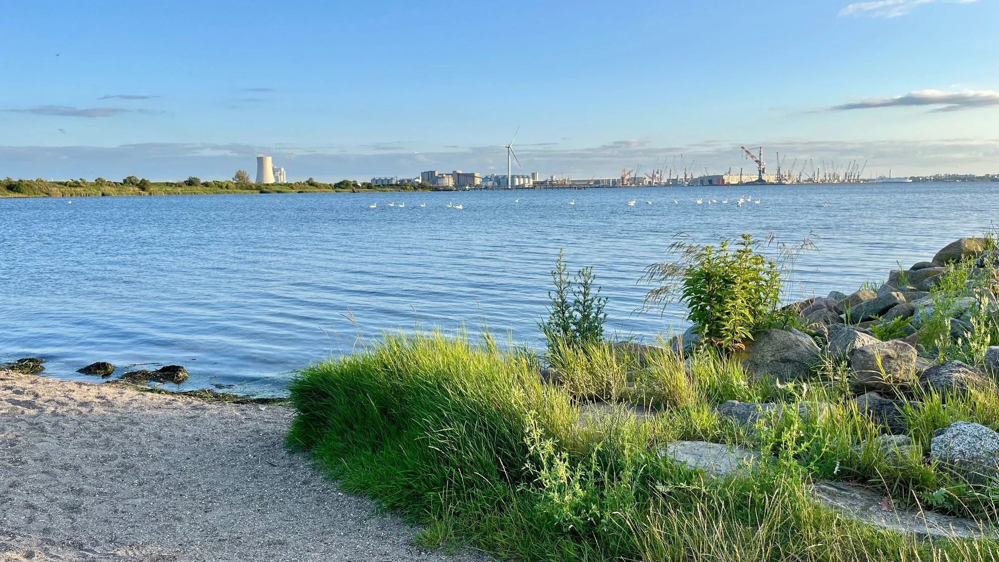 Na noc přejedeme na parkoviště u venkovské restaurace, jejíž hrázděná budova jako by vypadla z nějaké pohádky. Na oploceném pozemku pobíhají děti v pozdně školkovém nebo raně školní věku, asi tam tráví školu v přírodě. Celý večer posloucháme jejich veselému pokřikování a já jim trochu závidím, že tráví čas na tak kouzelném místě, kde les lemuje vysoké kapradí a o dvě stě metrů dál je malá písečná plážička. Co na tom, že v dálce lemují obzor obrovské jeřáby průmyslového přístavu.