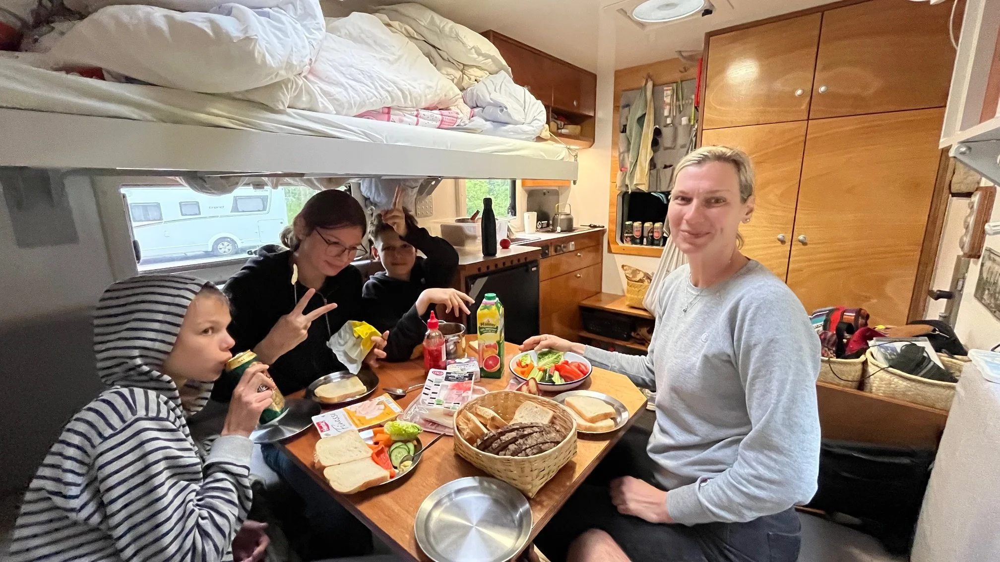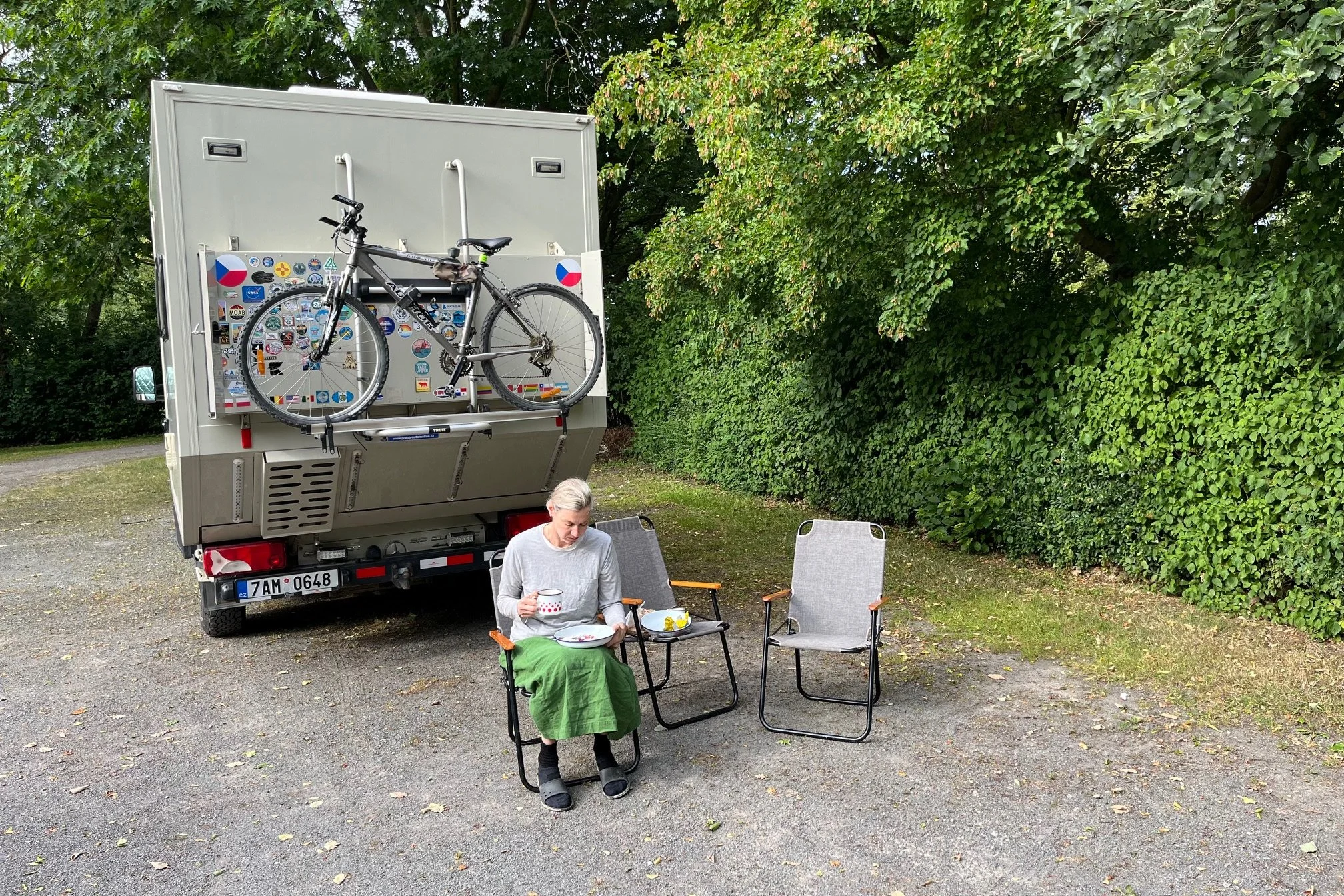 Zajdeme do supermarketu nakoupit. Koupíme konečně čokolupínky, taky mléko, ovoce, zeleninu, šunku, která už úplně došla a kuřecí maso, abychom měli z čeho vařit večeře. Vrátíme se k autu a přejedeme na placené parkoviště pro obytná auta jen asi 200 m od moře, kde je kromě nás jen 5 obytňáků s německými důchodci. Hlavní sezóna ještě nezačala. Všichni využijeme možnosti se osprchovat opravdovou sprchou. Prší a je chladno.