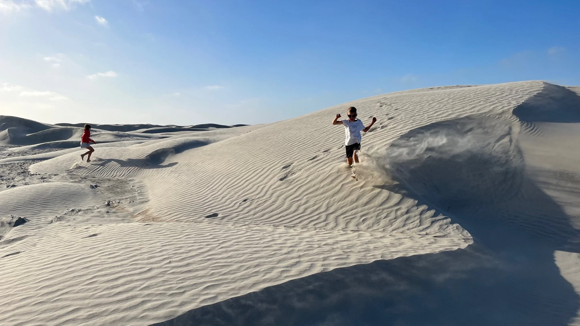 Máme štěstí, duny jsou opravdu písečné. Kromě nás tu nikdo není. Fouká vítr, přefukuje písek. Vybíháme z auta. Janek fotí. My ostatní dovádíme na dunách. Chodíme v nich bosky. Je to tak příjemné a osvobozující. Čirá radost.