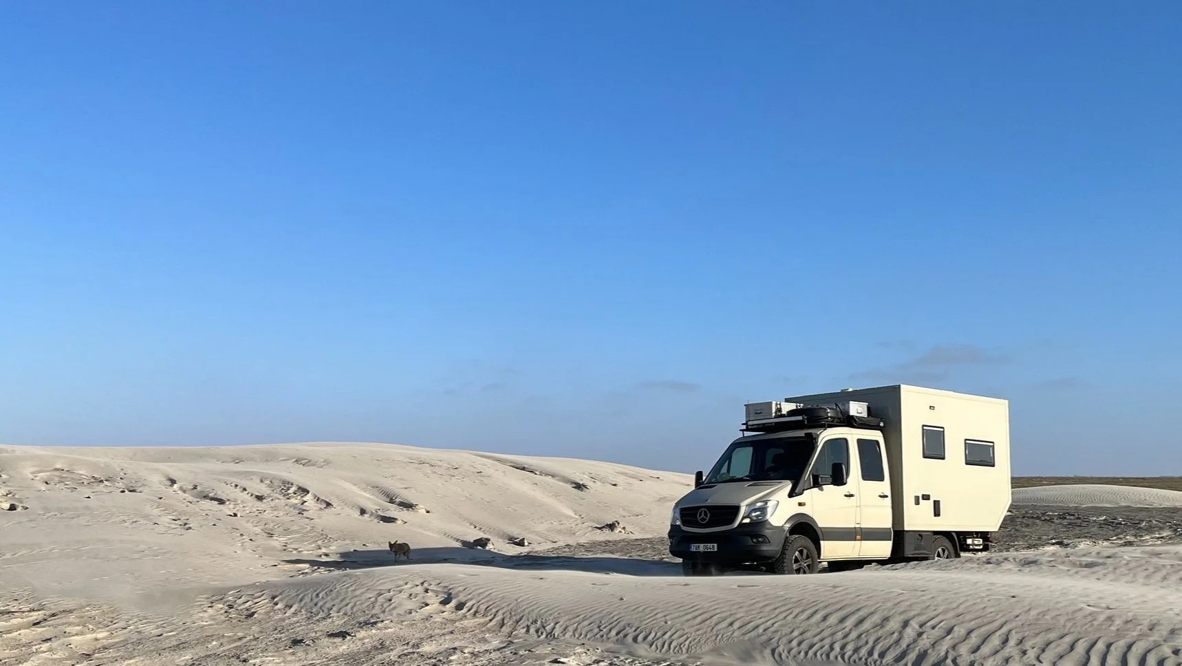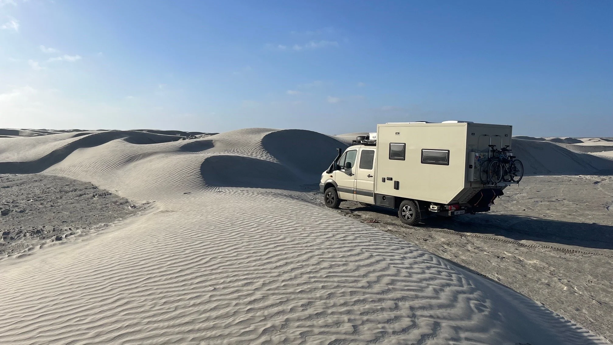 Cestou k dunám míjíme vojenské letiště. Kousek za ním končí asfaltka. Chvíli jedeme po oficiální prašné cestě značené v mapě, která ale zahýbá zpět k letišti. Duny už v dálce vidíme, vede k nim několik vyježděných polňaček. Vybíráme si tedy jednu z nich a zamíříme až přímo nim.